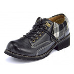 チェック柄を取り入れた、UKスタイルを感じさせる異素材コンビのレースアップブーツ。重厚感のあるタンクソールにヒールをプラスし、脚長効果は◎。シボムラ加工&アンティークゴールドのシューホールで大人っぽい上品な足元を演出してくれます。内側ジップで、編み上げたままでも脱ぎ履きスムーズです。
